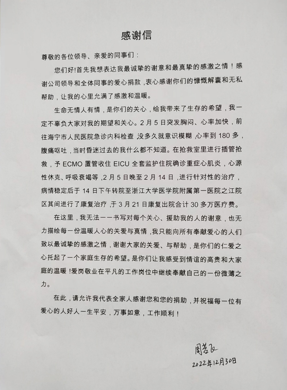 今年年初,周若飛突發(fā)重癥心肌炎,經(jīng)過一個(gè)多月的搶救和手術(shù)治療,最終挺過難關(guān),但花費(fèi)了一筆很大的醫(yī)療費(fèi)用,自費(fèi)費(fèi)用近20萬(wàn)元,給家庭造成了較大的經(jīng)濟(jì)壓力。為此,集團(tuán)員工關(guān)愛互助基金解員工之憂,按基金會(huì)章程規(guī)定,給予了周若飛頂級(jí)的醫(yī)療救助金。