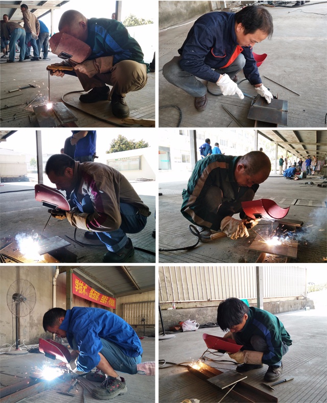 經過專業老師對比賽的要領和規則講解后,比賽進入了激動人心的實戰階段,參賽選手冒著炙熱的高溫,個個摩拳擦掌,躍躍欲試。電焊要求手工電弧焊——板對接平焊、單面焊雙面成形,按抽簽順序,5名選手同時進行。