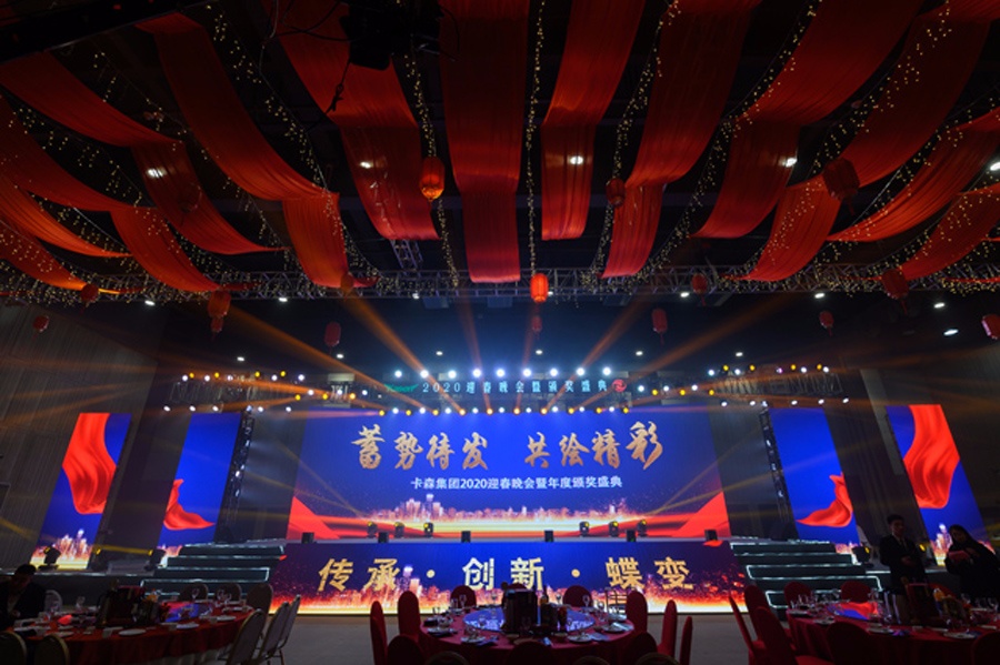 1月11日,海寧最大規(guī)模的企業(yè)年會——“蓄勢待發(fā) 共繪精彩”卡森集團2020迎春晚會暨年度頒獎盛典在隆聚宴會(海寧會展店)隆重上演,集團總部各部門、旗下子公司班組長以上及優(yōu)秀員工代表等約1600人歡聚一堂,共享企業(yè)豐收喜悅的榮光。年會以3D人屏互動視頻秀舞蹈——《太極光影》拉開序幕,科技感十足,充滿想象力,并以“卡森艦”“一帶一路”揚帆遠(yuǎn)航寓意企業(yè)開創(chuàng)美好未來。